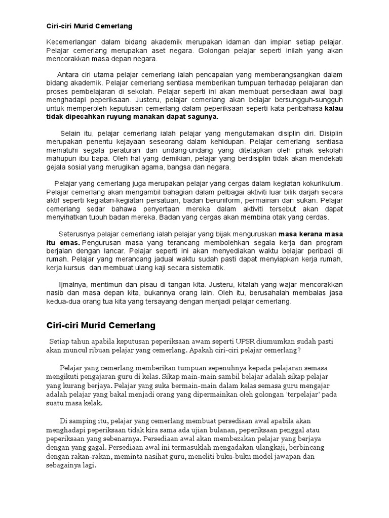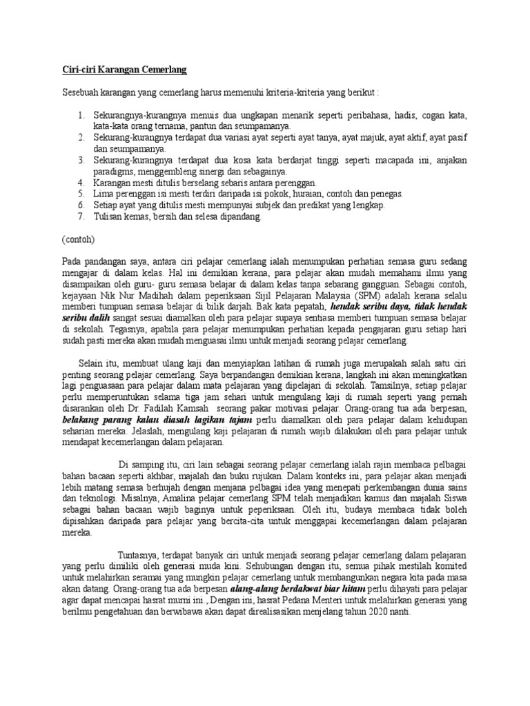 Karangan Spm from img.pdfslide.tips Sering mengeluarkan air mata dengan sendirinyaa, padallah tidak dalam keadaan sedih. Ciri ciri pelajar cemerlang contoh soalan: Karena itulah ayam jenis ini selalu menjadi primadona bagi para pecinta ayam terutama ayam petarung. Pantun adalah jenis puisi lama yang memiliki aturan dan ketentuan yang mengikat. Sentiasa yakin pada potensi diri sendiri. **karangan yang disediakan ialah karangan cemerlang dalam spm. Contoh menjalankan ujian minat kerjaya dan ujian personaliti. Pelajar cemerlang sentiasa memberikan tumpuan terhadap pelajaran dan proses pembelajaran di sekolah.